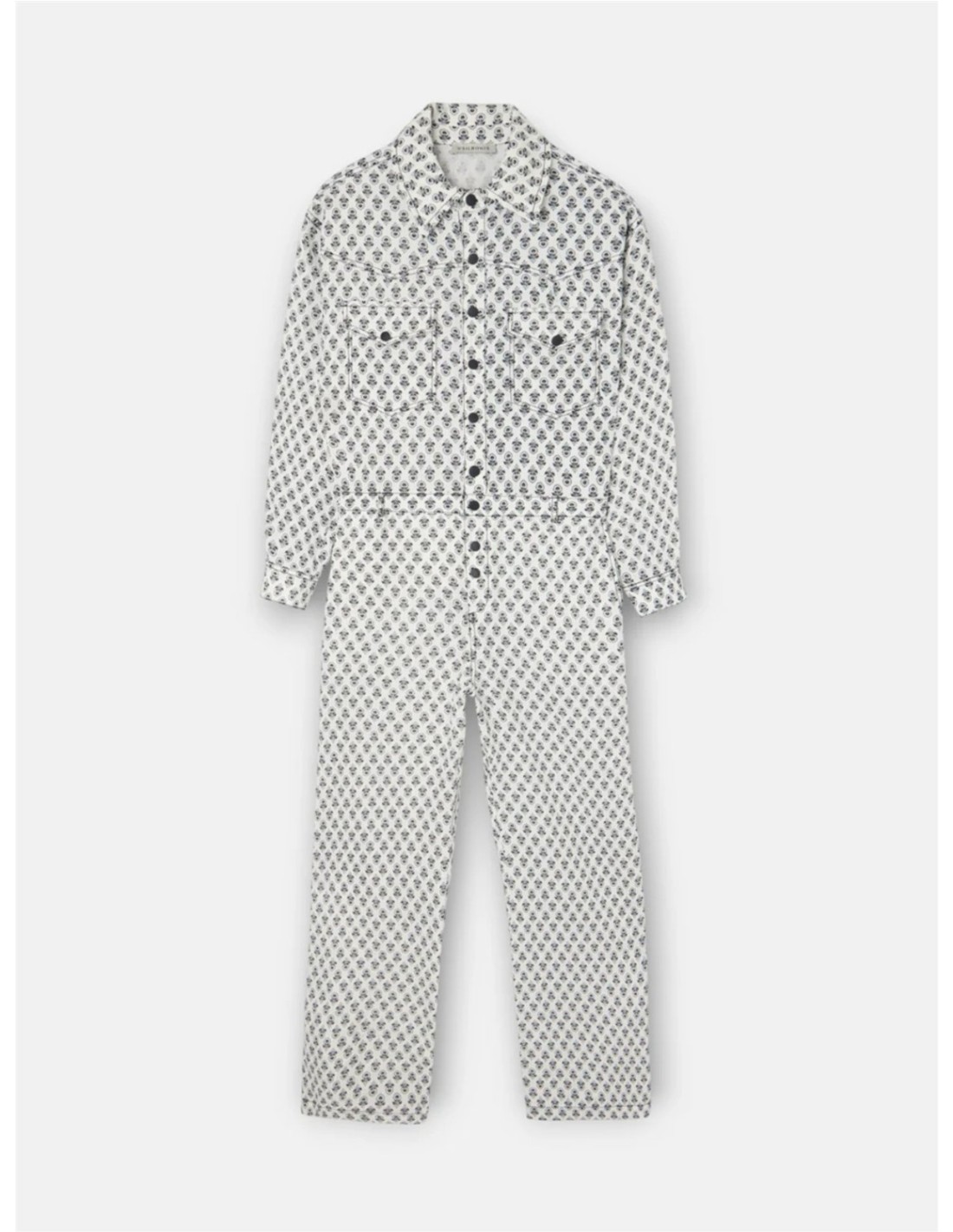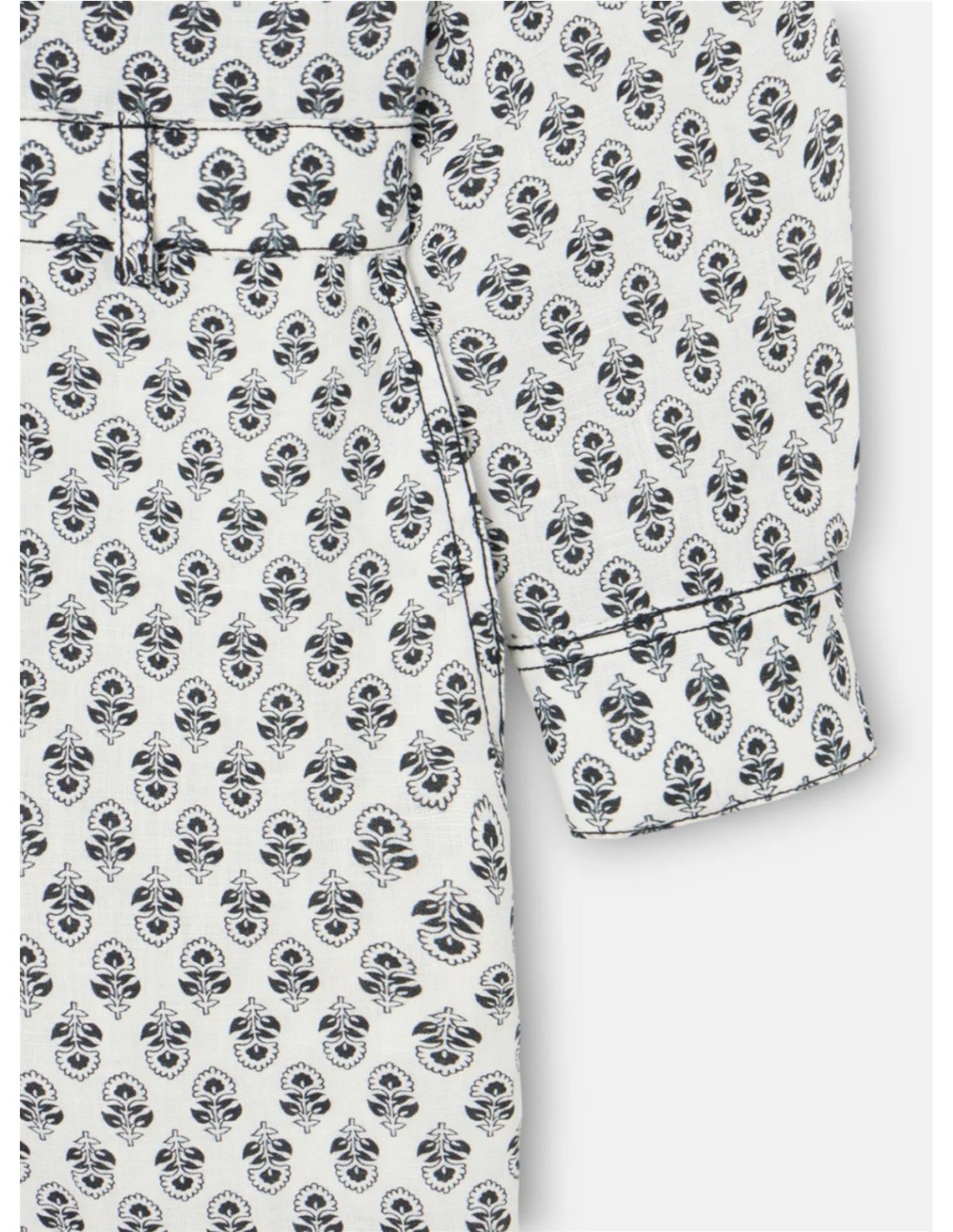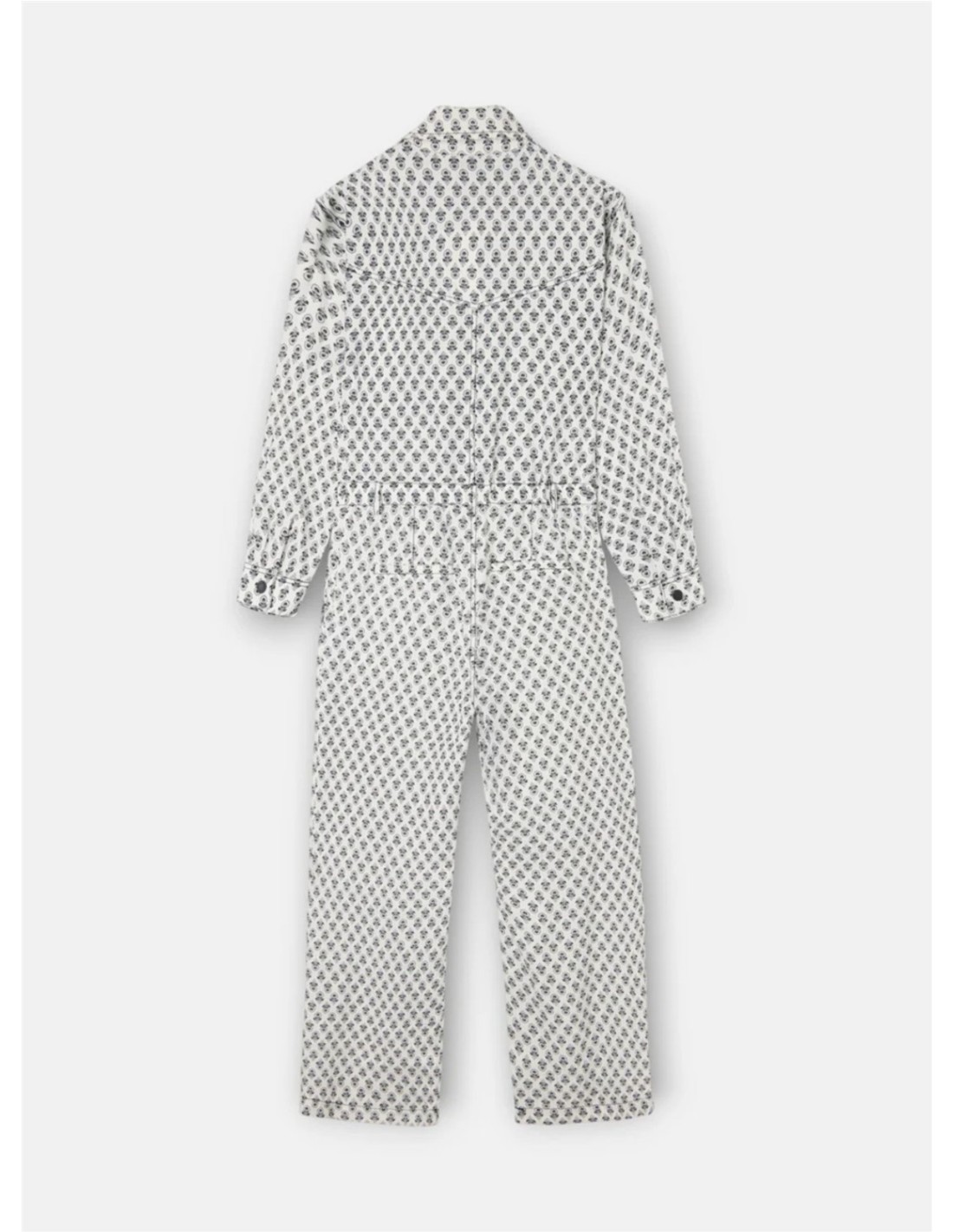 Mono blanco estampado confeccionado en lino 100% con corte recto de la marca Silbon. Presenta cuello y puños estilo camisero, bolsillos de parche en el pecho y corte en cintura. Cuenta con botonadura central mediante snap negros personalizados.