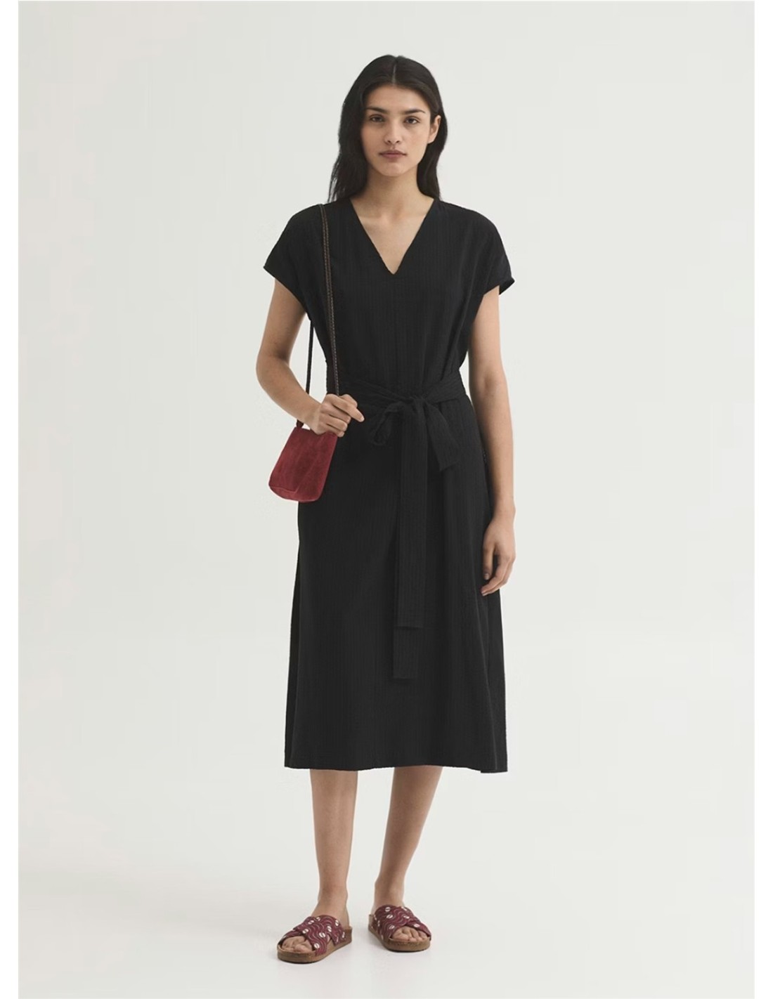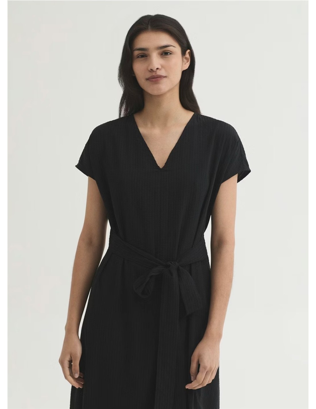 Vestido envolvente tejido seersucker de lyocell y algodón en color negro de la marca Nice Things. Escote pico. Tiras del mismo tejido sujetas en la cintura para cerrar y ajustar el modelo.