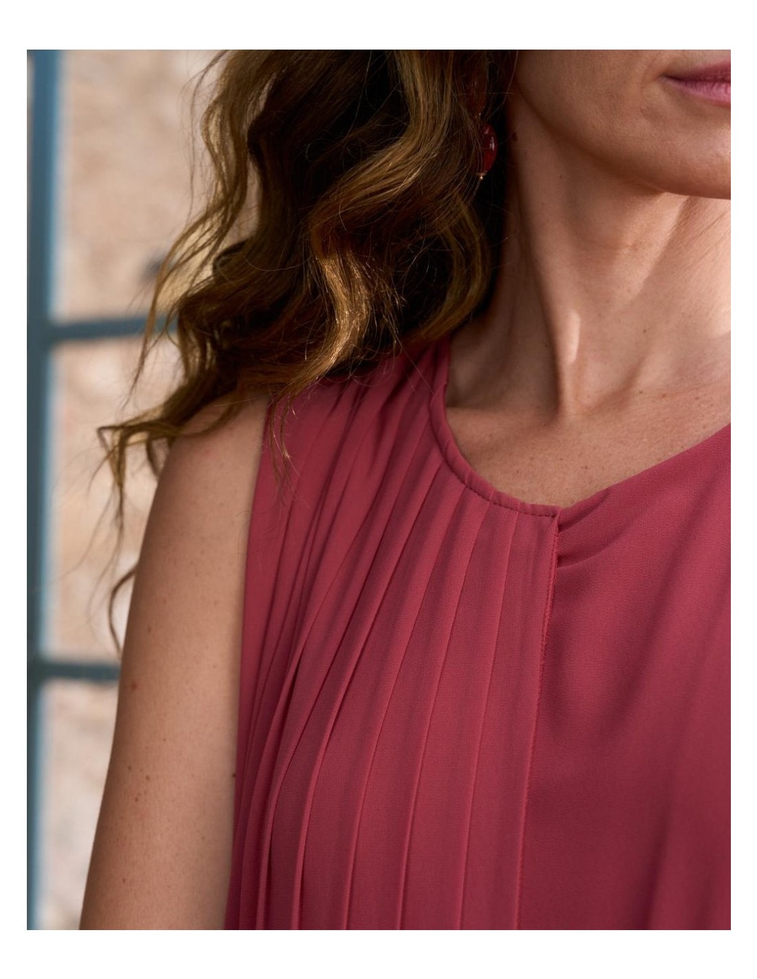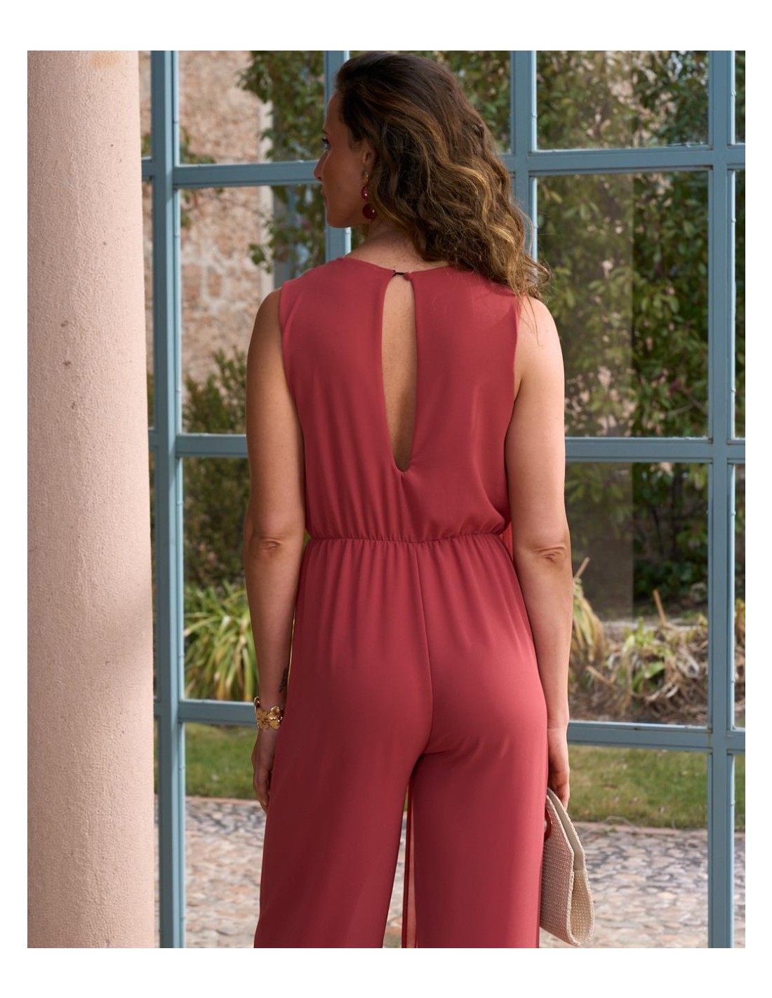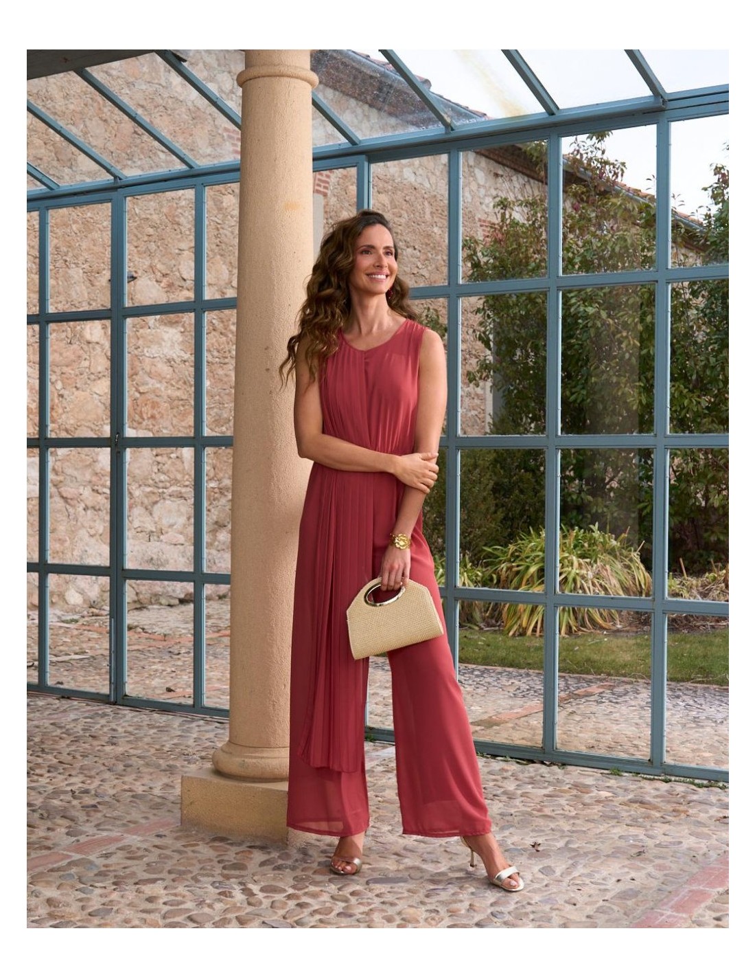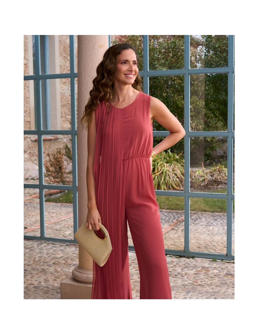 Mono largo en tono maquillaje liso. Confeccionado con un tejido ligero y suave, con escote cerrado, sin mangas, es un mono que se ajusta a la cintura lo que realza la silueta. Mono de invitada ideal para cualquier evento o celebración de momentos especiales.