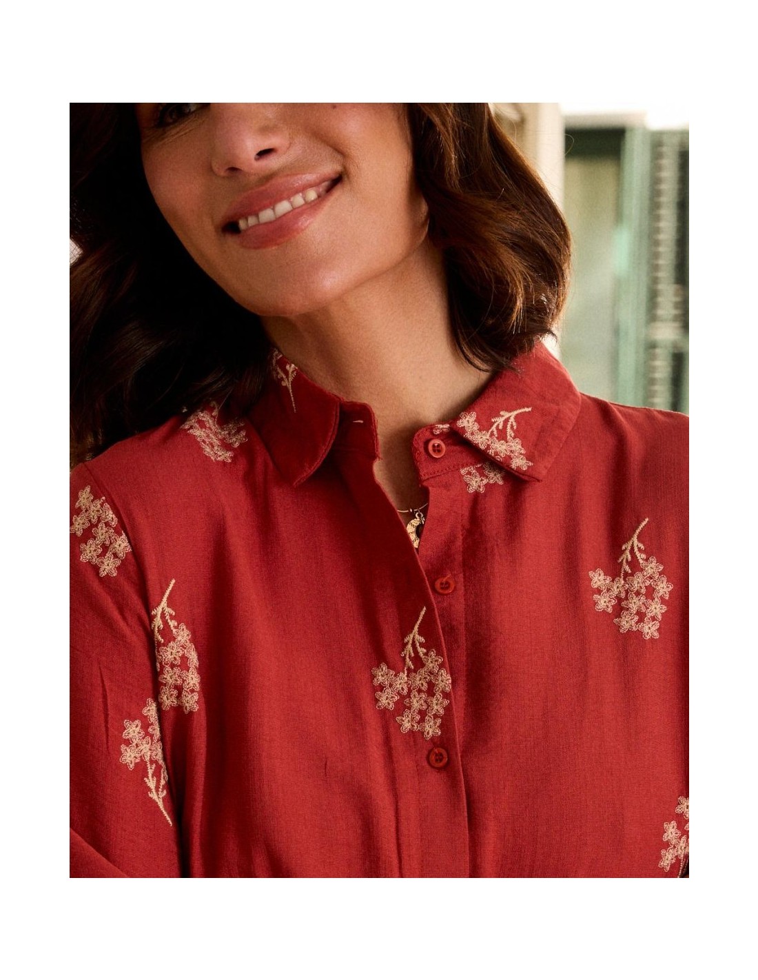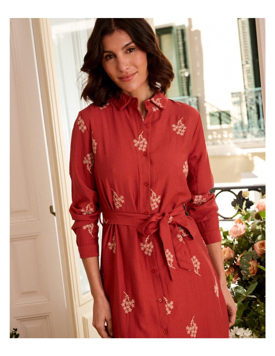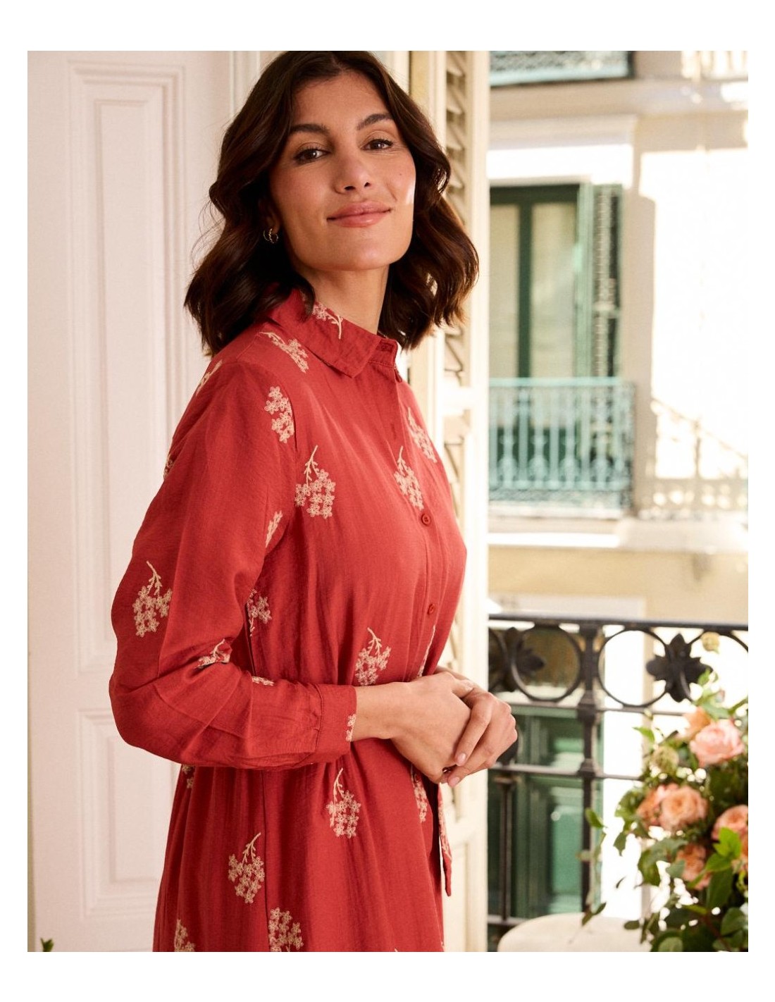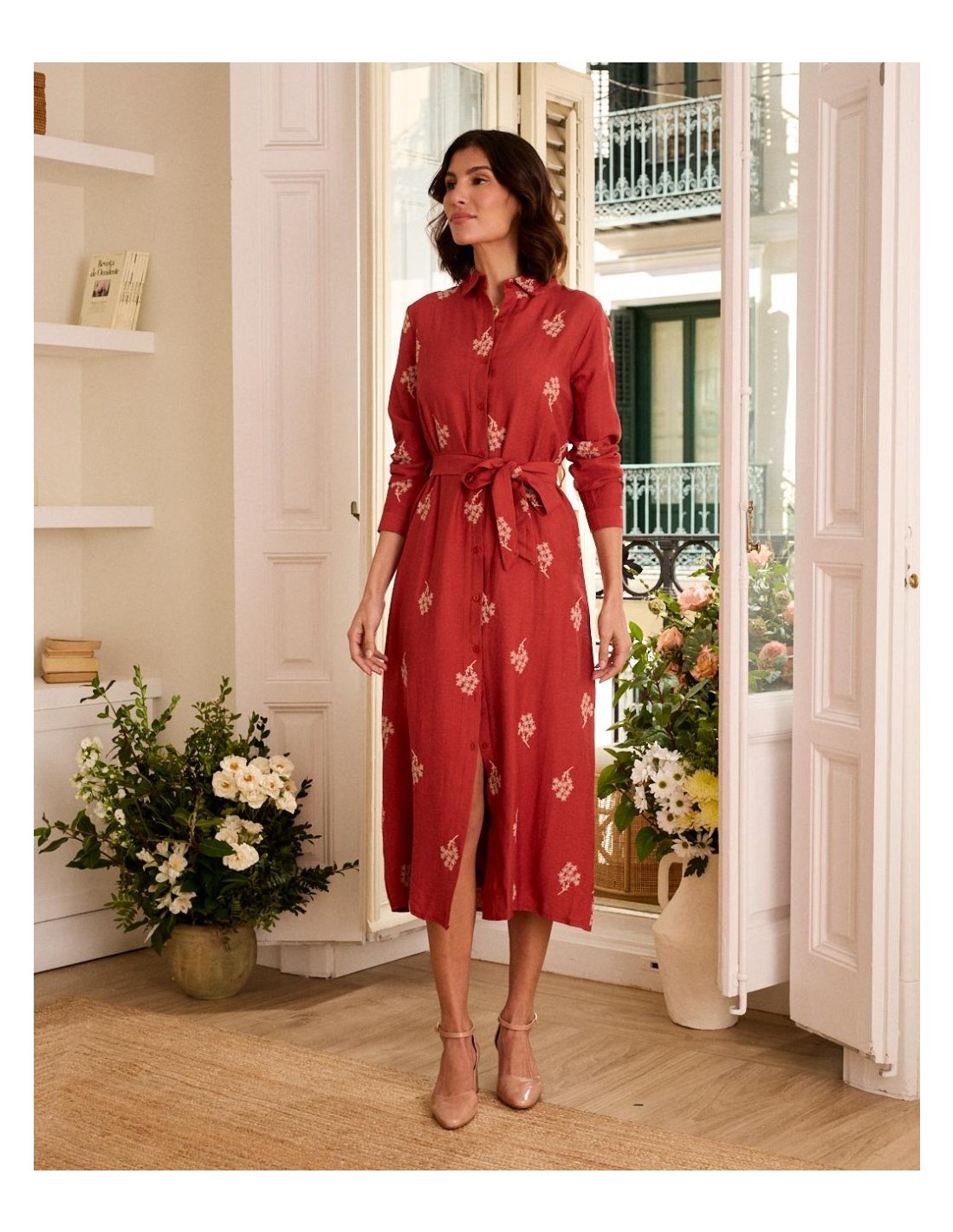 Vestido largo estampado en color rojo con detalles en color beige. Destaca por su estilo camisero, abotonado de arriba abajo, con corte recto y de manga larga.