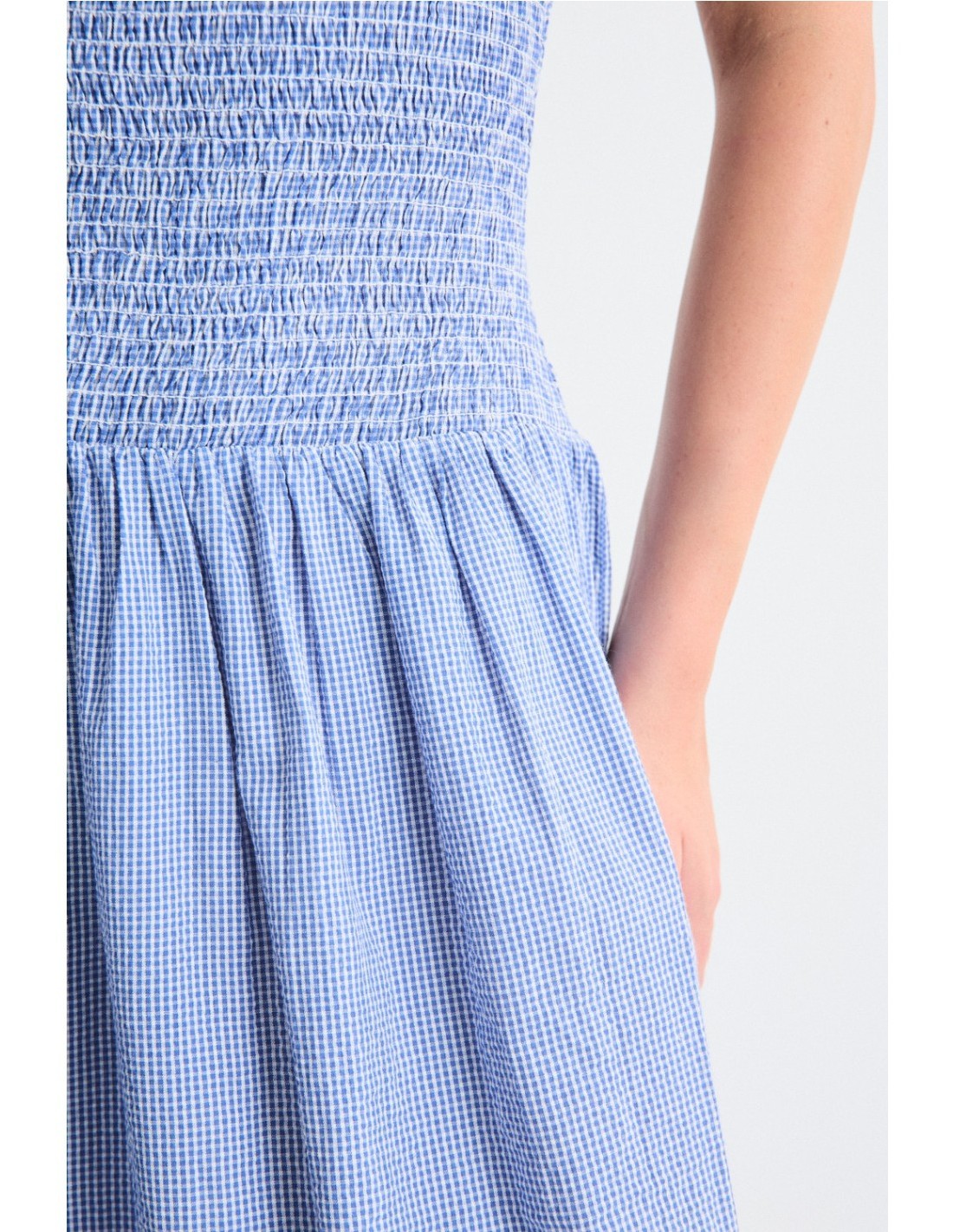 Vestido sin mangas confeccionado en tejido especial destaca por su nido de abeja elástico hasta la cadera. Una pieza versátil, ideal para los días de verano. También disponible la falda y el vestido de la misma familia, para un total look cottagecore con un toque actual.