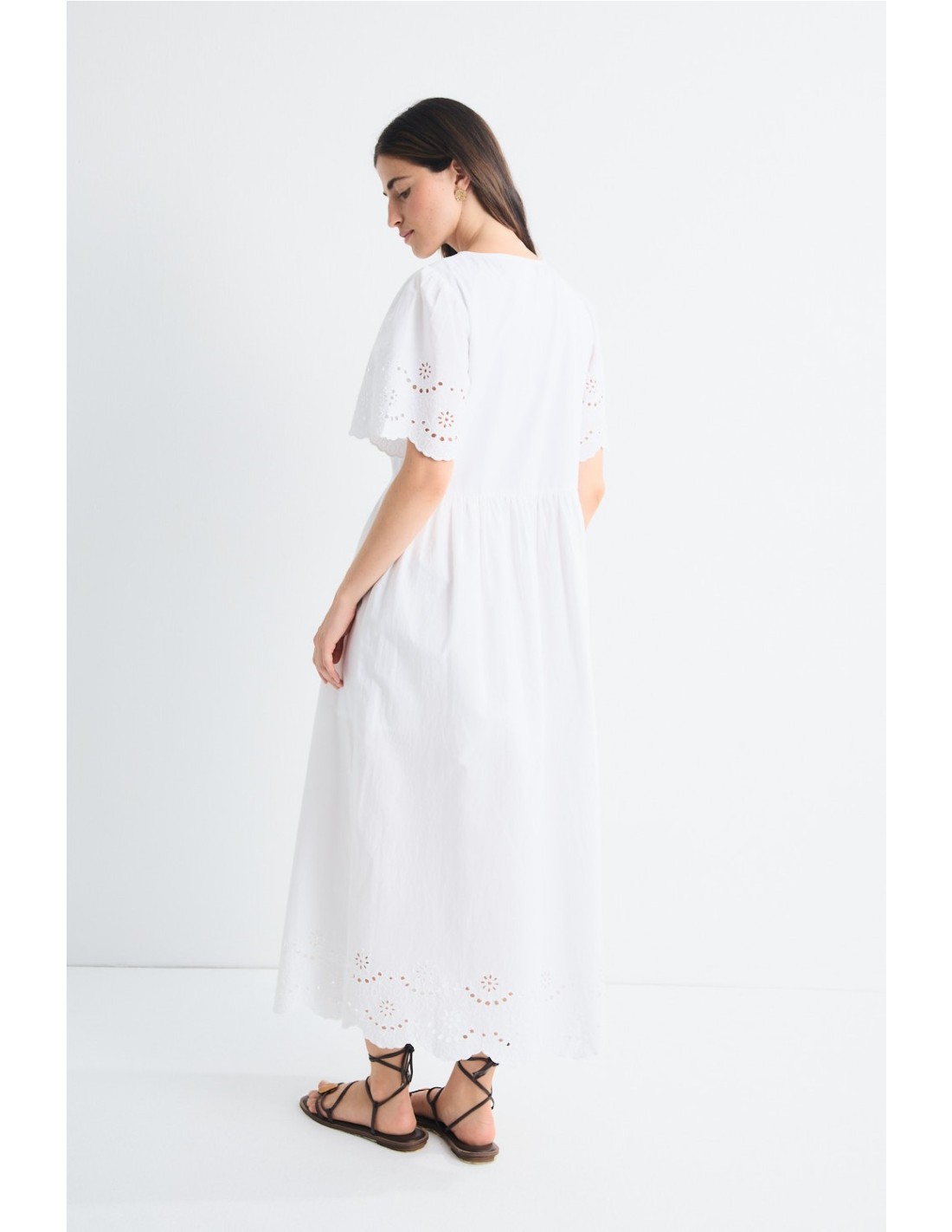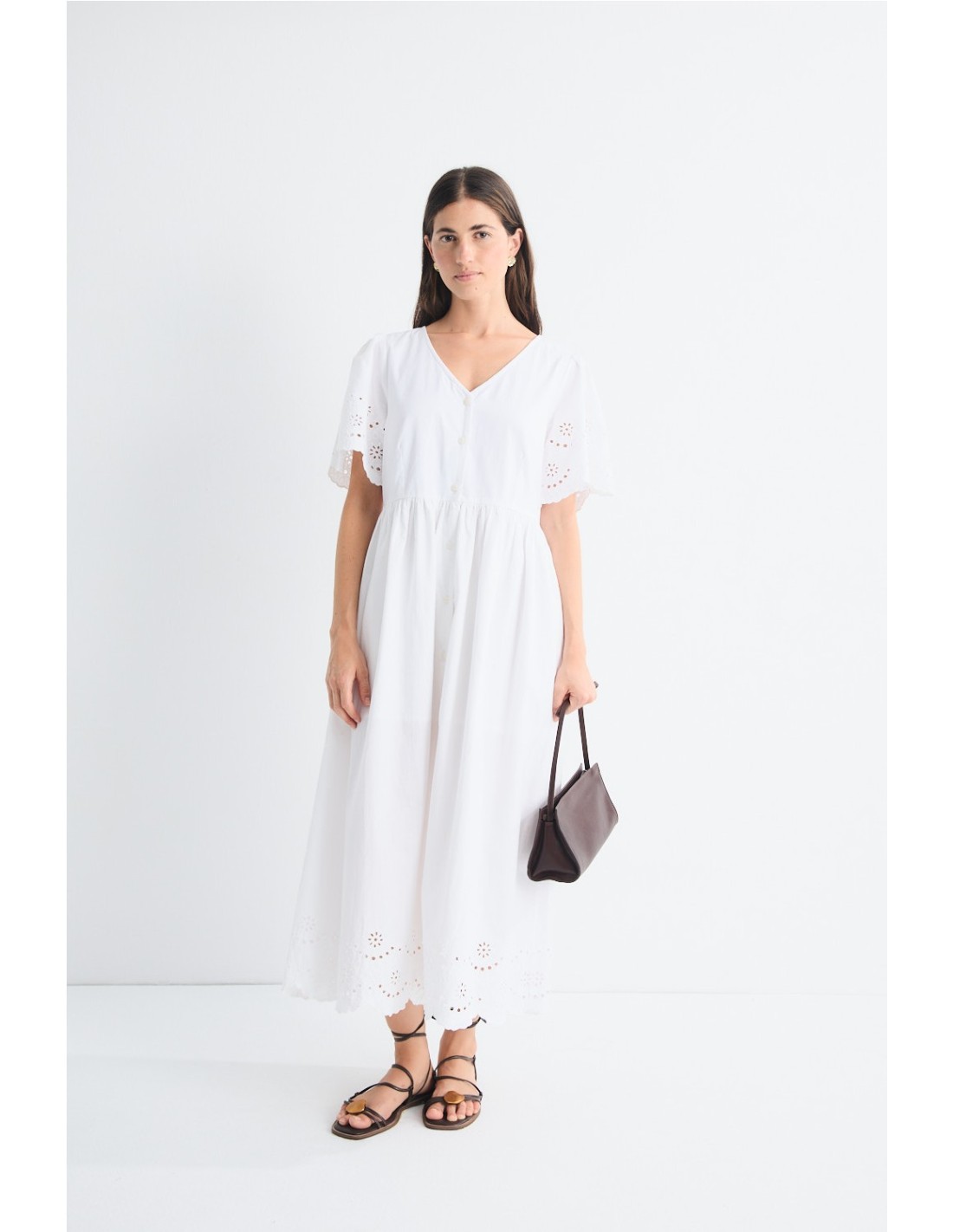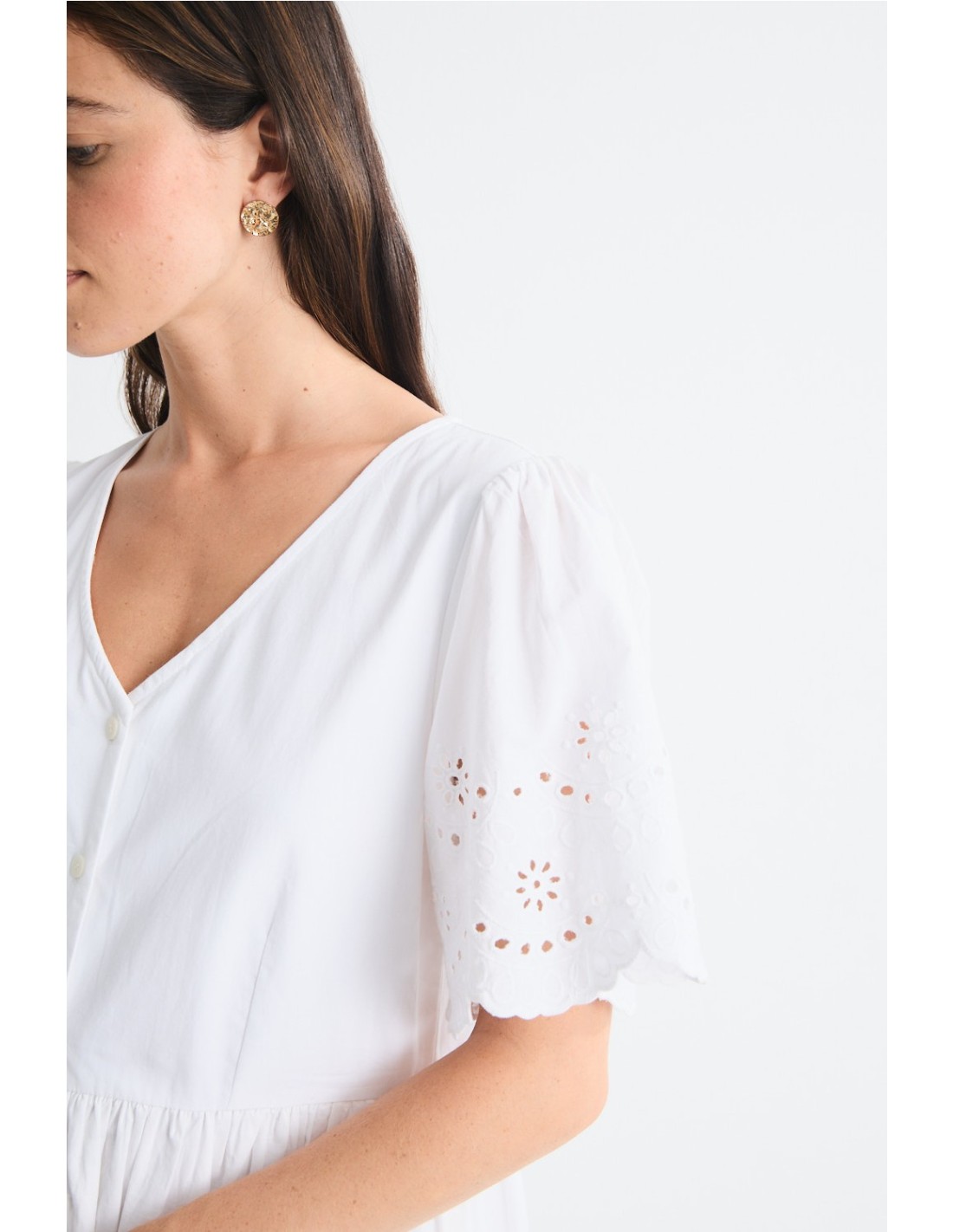 Vestido de manga corta abullonada con delicados bordados en el bajo y las bocamangas. Presenta un corte en la cintura y se cierra con botonadura frontal. Descubre la camisa y los shorts Ocaso para un total look fresco y veraniego.