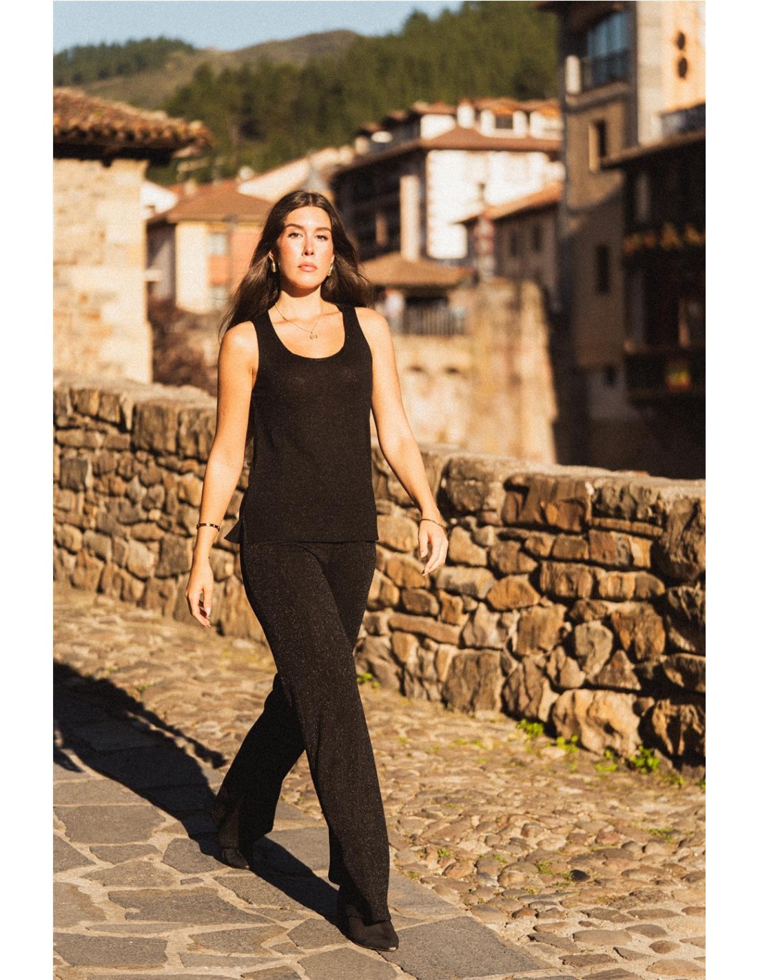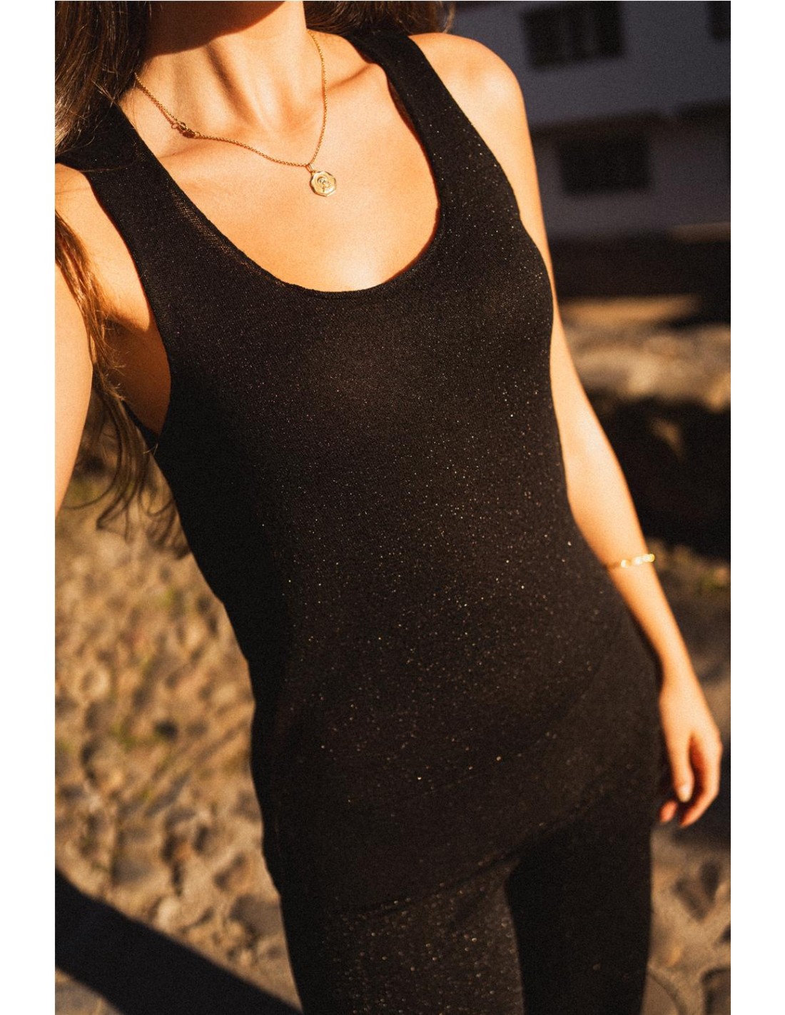 Top ligero de tirantes en tejido lúrex color negro de la marca Mus&Bombón. Tiene aberturas laterales y escote redondo.